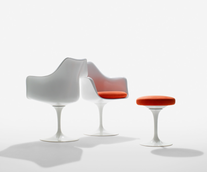 사리넨의 대표작으로, 다리가 줄기이고 꽃잎이 등받이와 좌판의 형상을 한 튤립 같다 하여 튤립 의자로 불린다. 사리넨은 다리와 상부구조가 유기적으로 하나가 되는 의자를 디자인하고 싶어했다. 사실 튤립 의자는 일체형 같이 보이지만 다리와 상부를 분리 제작해 결합하는 구조이다. 등받이와 좌판은 섬유유리로 사출성형하고, 다리 부분은 알루미늄으로 만들어서 연결한다. 슬림하고 섬세한 디자인으로, 시대를 타지 않는 새로운 클래식이 되어 여전히 사랑받고 있는 모델이다.